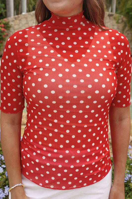 Kora Short Sleeve Mesh Top- Red Polka Dot