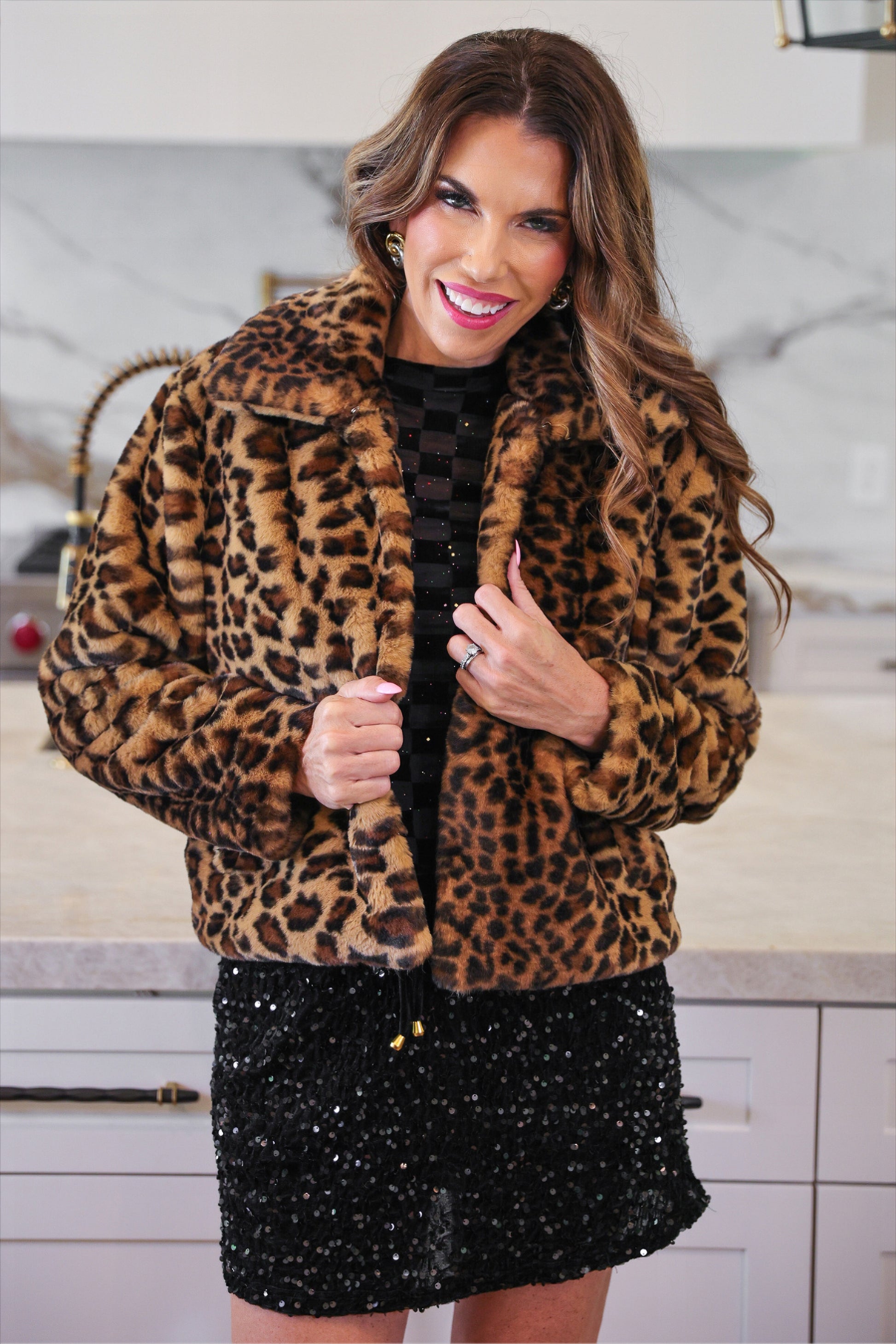 The After Midnight Faux Fur Leopard Jacket is your new go-to for a night out—chic, stylish, and perfect for staying warm in the colder months. Made to steal the spotlight, its soft plush texture, sharp collar, and sleek waist-skimming fit bring chic style to any look.