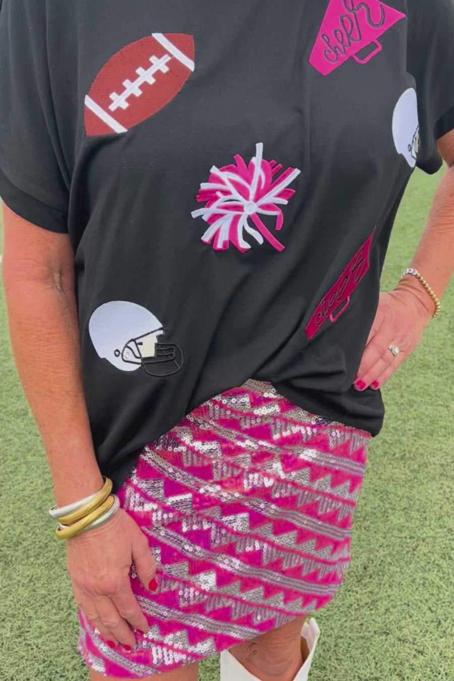 Support your team in style with our Cheer Squad Embroidered Top. This boxy tee features pink embroidered footballs, pom poms, megaphones, and helmets, adding a playful touch to your game day outfit. Show off your team spirit and stand out from the crowd.
