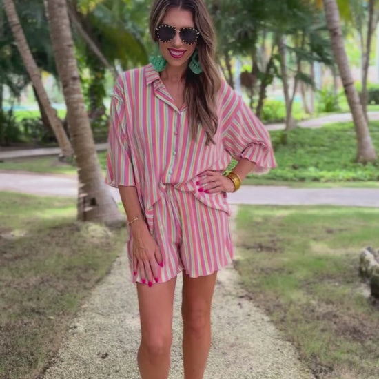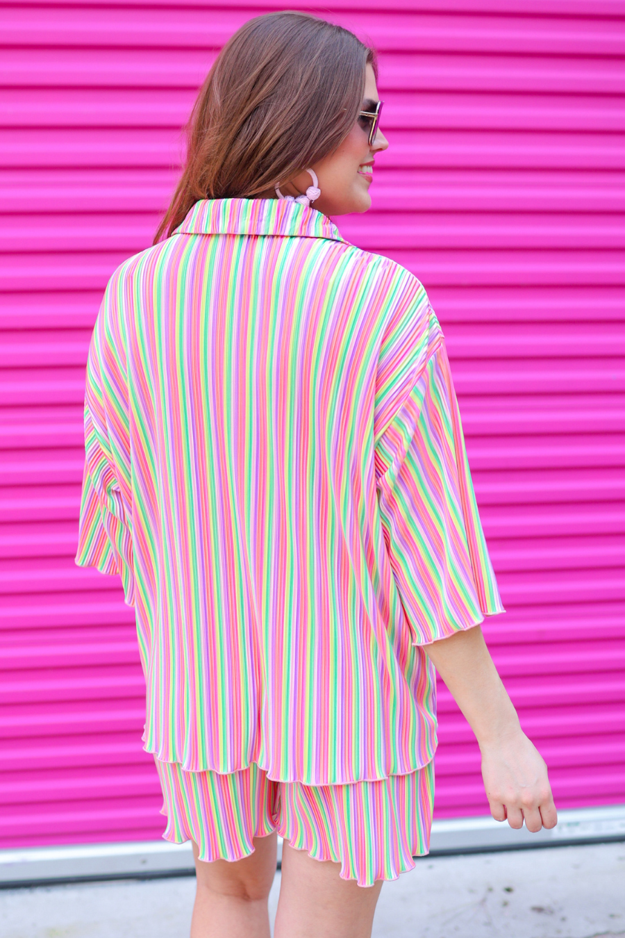 Get ready for a dreamy day in our Dreamy Daze Pleated Set! This fun and colorful set features half sleeves, lettuce hemlines, and a button up design with an elastic waistband for a comfortable fit. Perfect for a playful and stylish look.