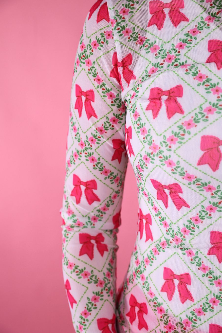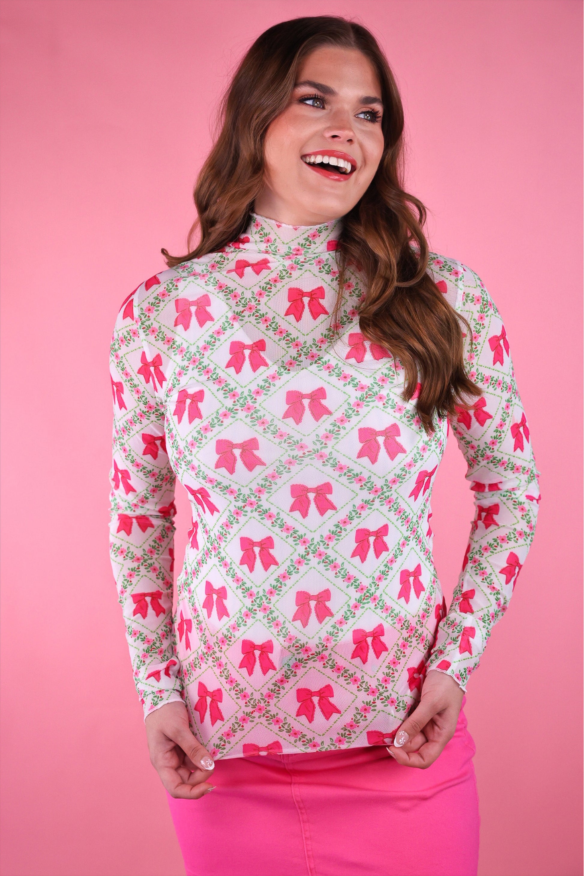 Get trendy with the Keigan Mesh Top - Pretty Lattice Bow! This playful top features lettuce hems, a mock neckline, a chic bow and lattice print, and a sheer mesh material that can be layered under or over any outfit. Don't miss out on this must have piece!