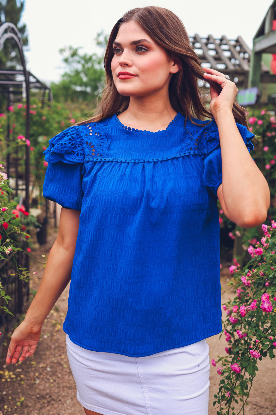 This royal blue top is anything but basic. The textured fabric adds dimension, while the eyelet ruffle and puff sleeves bring a playful touch. Get ready to turn heads and make a statement.