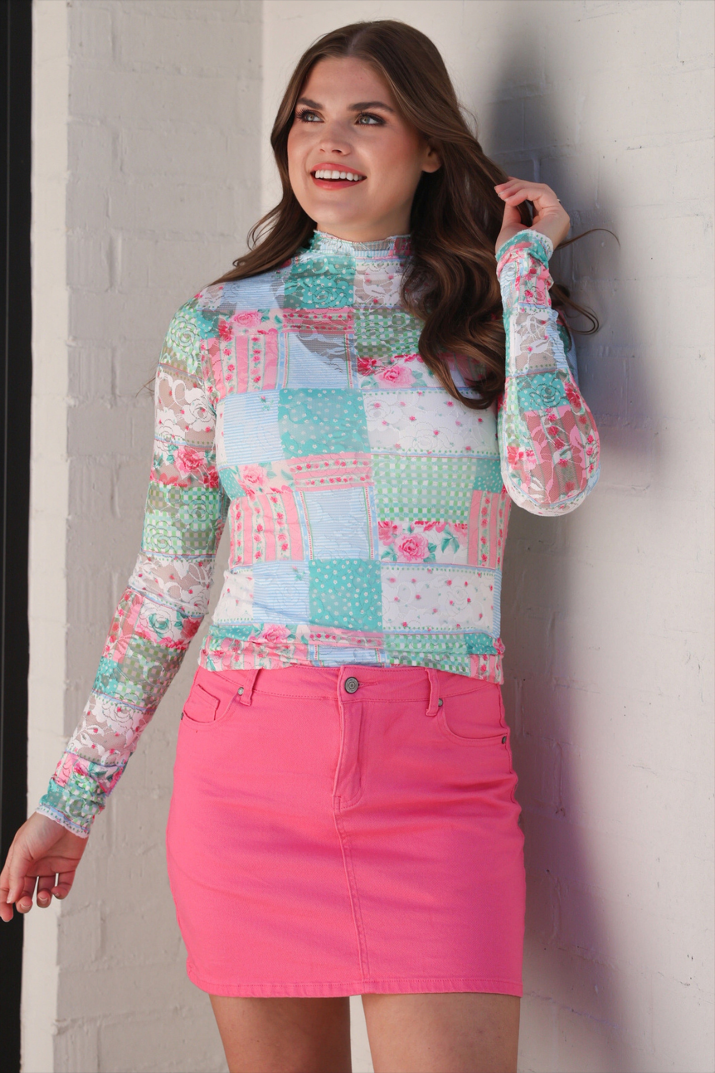Embrace early spring vibes with the Kylie Lace Top in playful printed lace. This fitted design features long sleeves and a chic mock neck, perfect for layering or wearing solo as the season blooms. Light, feminine, and effortlessly stylish, it’s your go-to piece to brighten up any outfit.