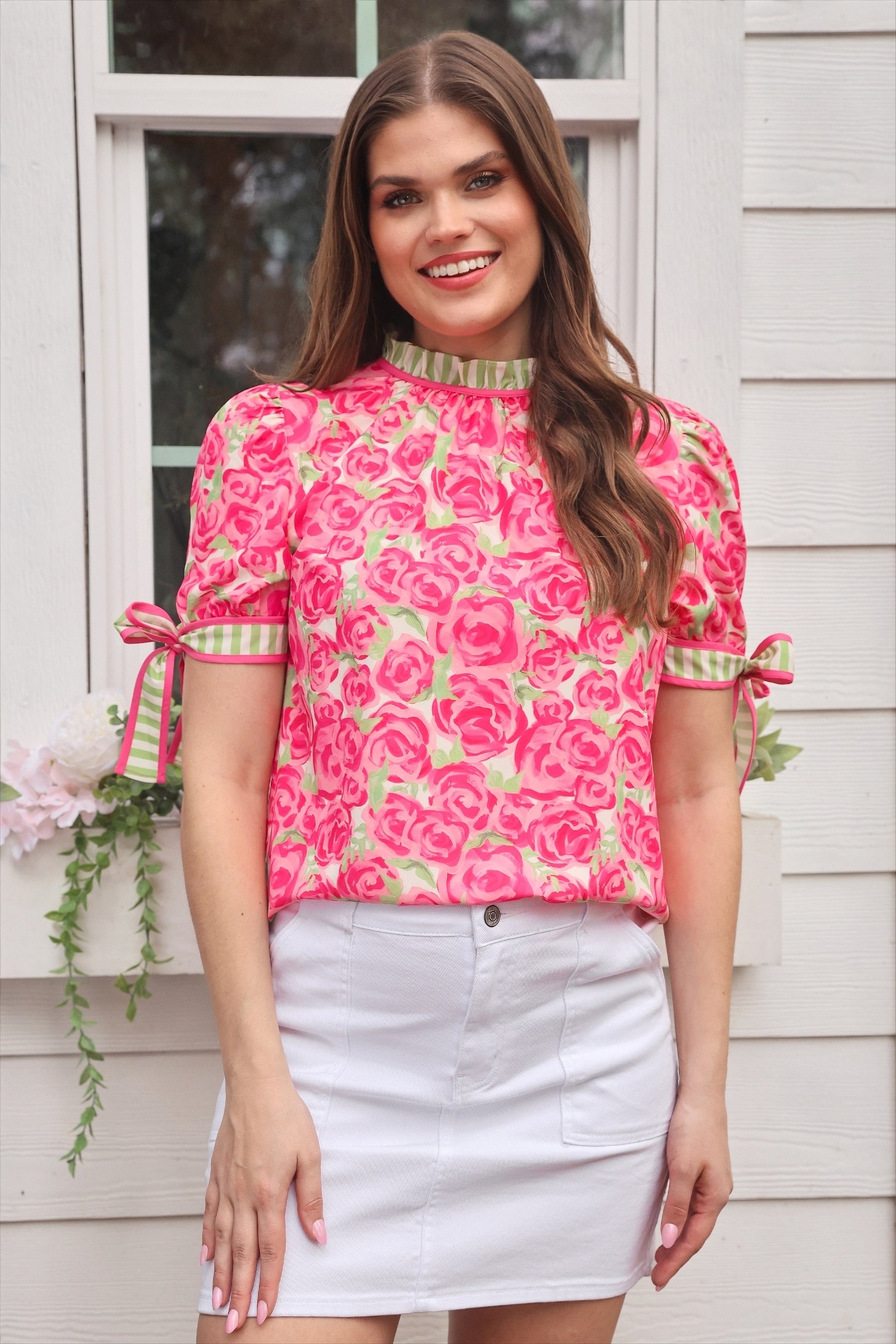 Elevate your spring wardrobe with the Lana Top in Sweet Roses—a gorgeous floral piece that's equal parts romantic and fun. Delicate rose prints take center stage while chic striped accents at the neckline and sleeves add just the right touch of personality. Whether you're dressing up for brunch or keeping it casual, this top brings effortless style and a playful vibe to every outfit. Spring has never looked so good!