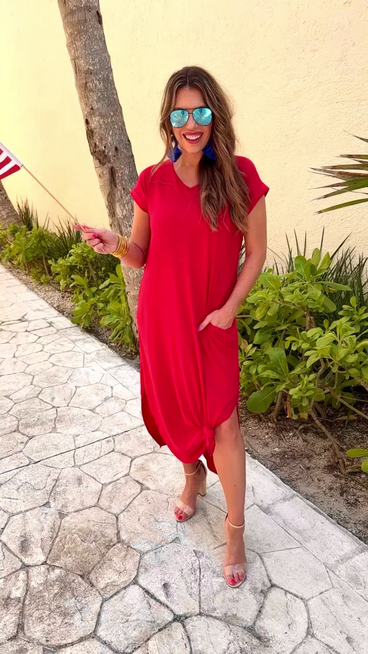 This dress is one you will want to outfit repeat all season long! The fabric is so soft, comfy, and stretchy. It features a v-neck, cuffed sleeves, side slits in both sides, and the best part, it has pockets! You can wear this dress so many ways, including tied up on the side, your possibilities are endless! Fits oversized.