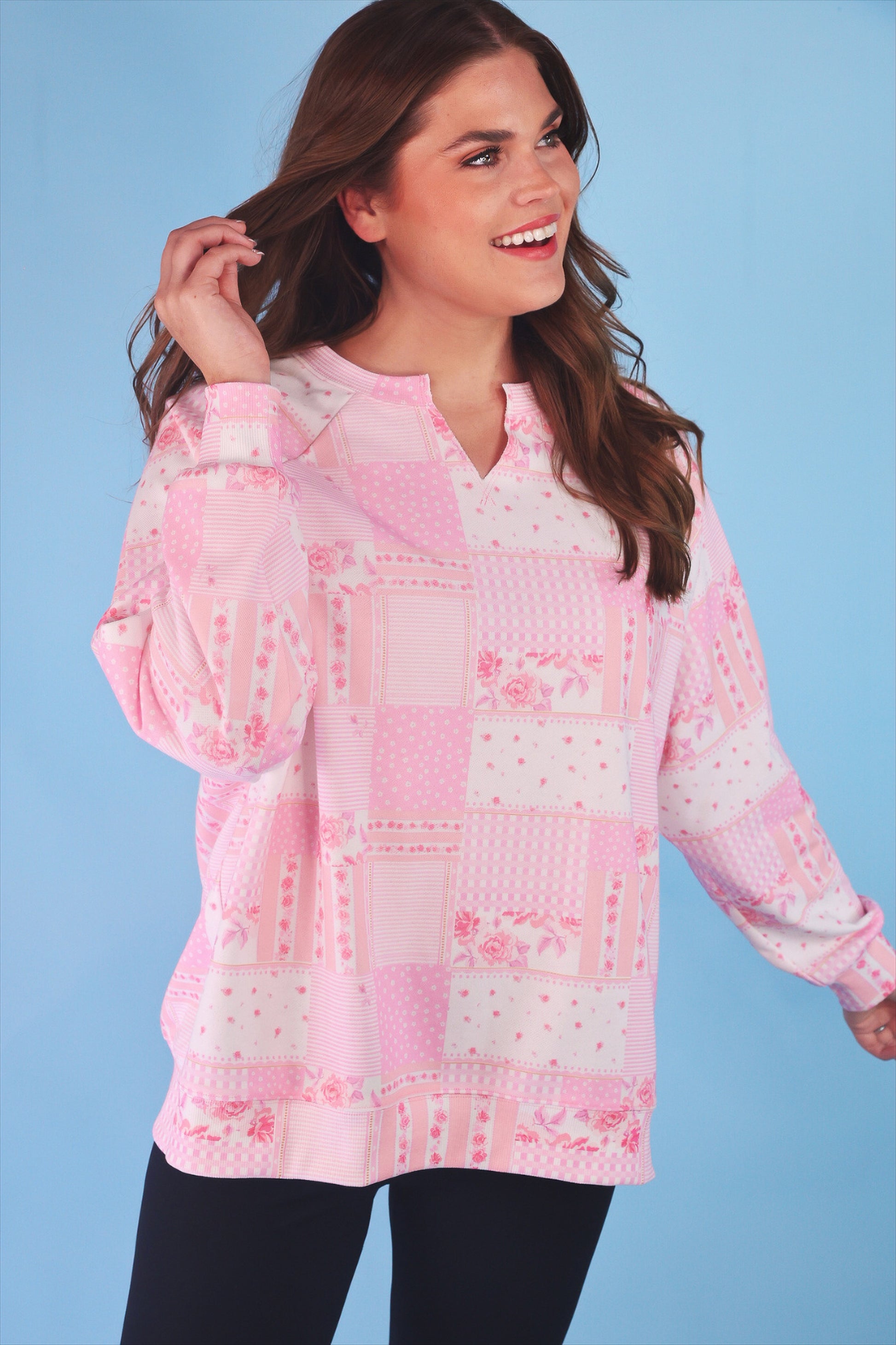 Welcome the Riley French Terry Pullover in Pink Patchwork—the ultimate choice for those easygoing days spent relaxing or on the go in stylish comfort. Its unique french terry fabric brings a playful touch and cozy feel to your wardrobe. Perfect for chill vibes, this spirited pullover will quickly become your favorite grab-and-go piece!