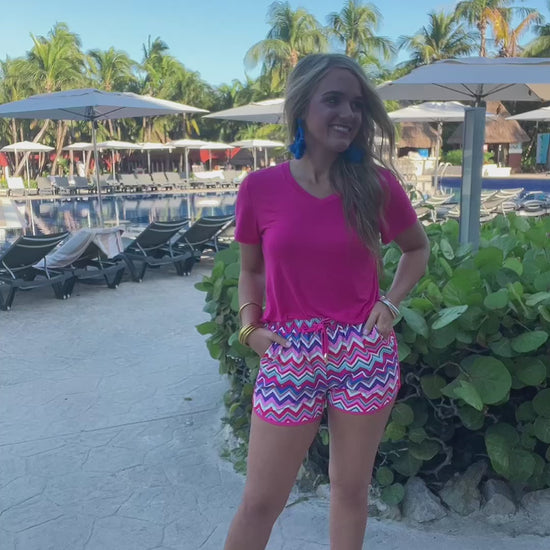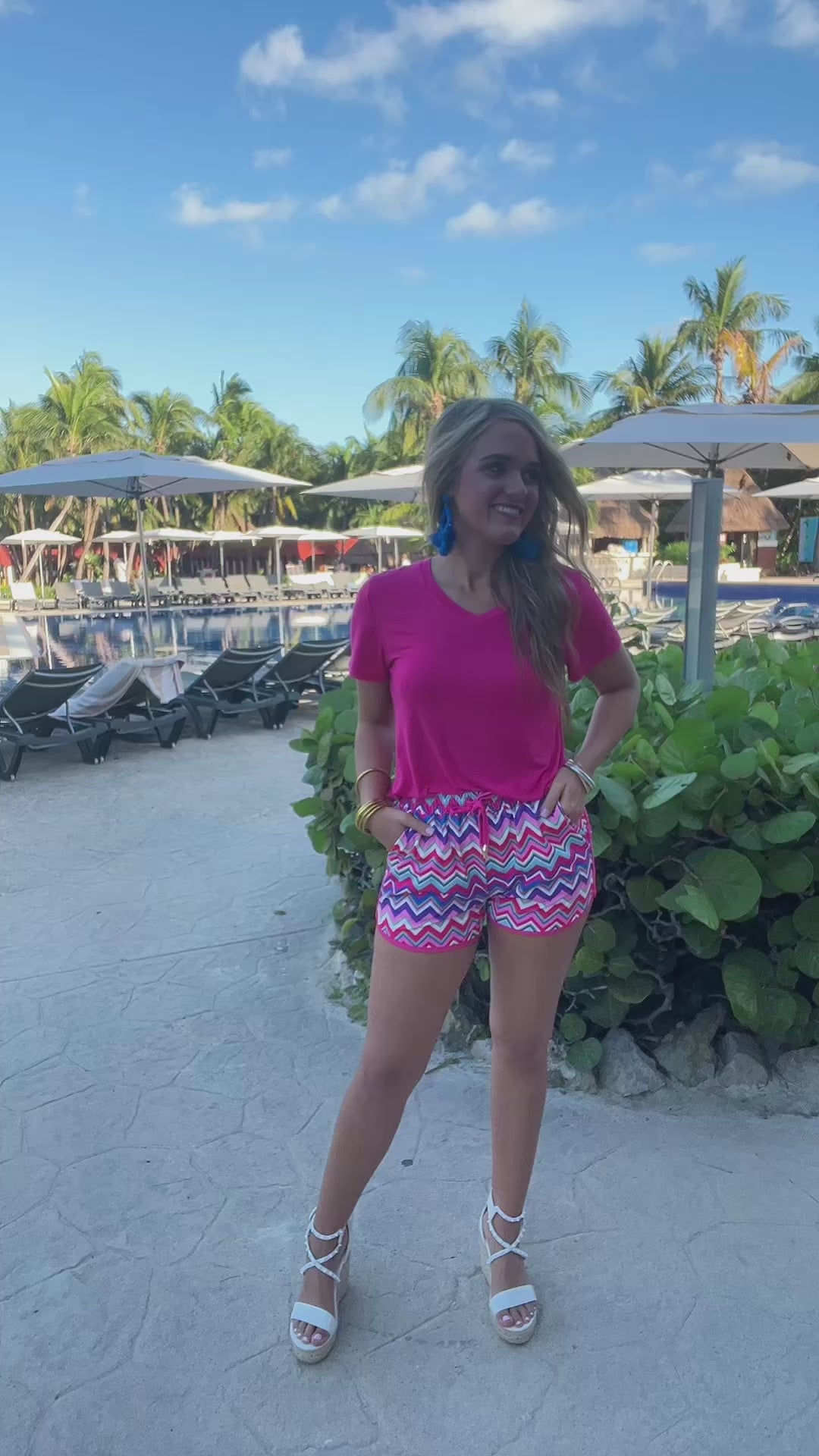 These mid-rise zig zag print shorts are so perfect for the spring and summer and even to wear in to the fall! Get the effortless yet chic look with these shorts. They feature a mid-rise, tie waist drawstring, & side pockets. These are a relaxed fit.